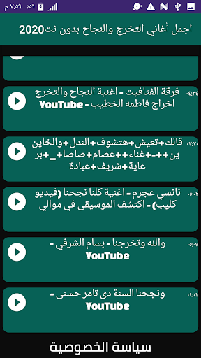 اجمل أغاني النجاح والتخرج بدون نت 2020 هو برنامج يحتوي على مجموعه من الاغاني الطربيه ذات الصوت الشجي وهي مجموعة اغاني تخص النجاح والتخرج والتفوق وهي اغاني بدون نت وهذه الاغاني هي اغنية نجحنا واغنية بروموو واغنية تخرجنا وحققنا الاماني واغنية خلصنا الدراسه واغنية على طار الفرح نحكي واغنية النجاح والتخرج واغنية قالك تعيش هتشوف الندل والخاين واغنية كلنا تفوقنا واغنية والله تخرجنا واغنية نجحنا السنه دي