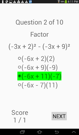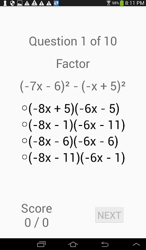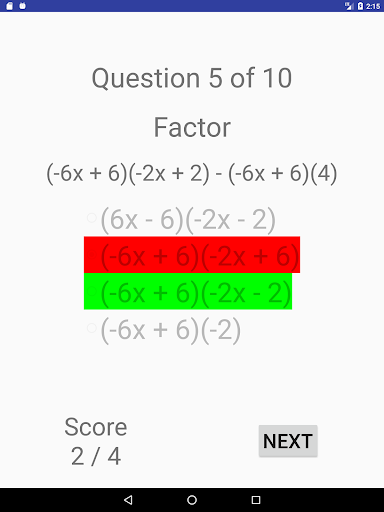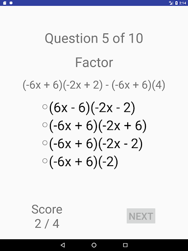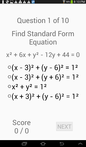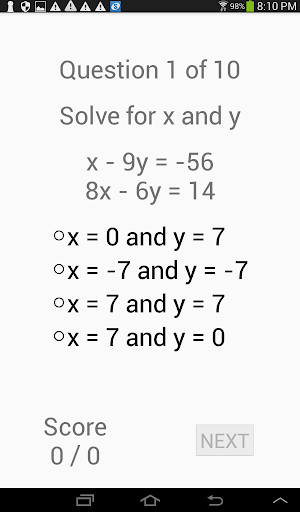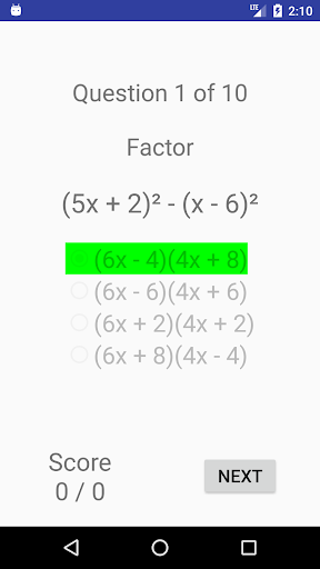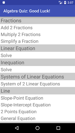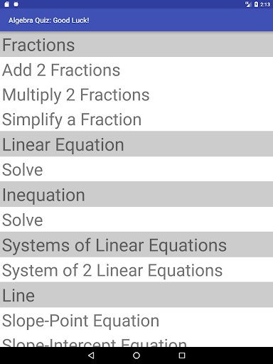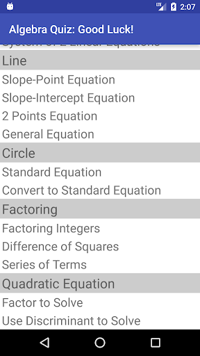 An algebra quiz app. Choose from a variety of topics: fractions (add, multiply, simplify), lines (slope-point, slope-intercept, 2 points, and general equation), circles, linear equations, system of linear equations, linear inequations, factoring (integers, difference of squares, series of terms), quadratic equations. Each topic include a very large number of quiz examples.