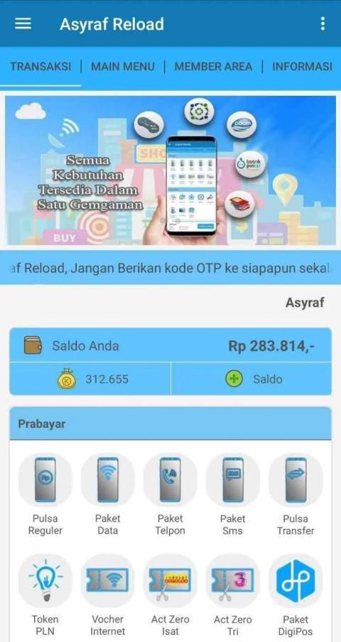 Asyraf Reload android application is a free mobile application for partners or loyal members of Ashraf Reload wherever located. This application makes it easy for you to perform various transactions such as topping up pulses, purchasing electricity tokens, paying postpaid bills, purchasing game vouchers, and others.