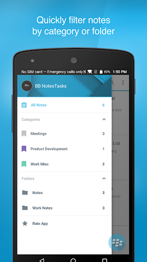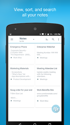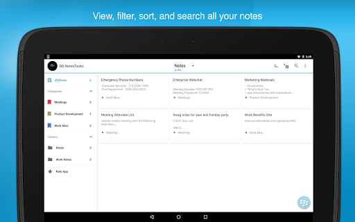 BlackBerry Notes is an enterprise PIM application that allows you to create, edit, and manage notes that are synchronized with Microsoft® Exchange.