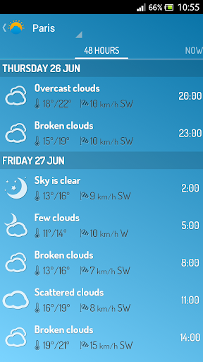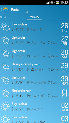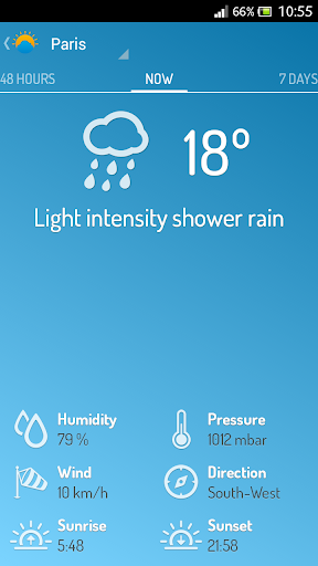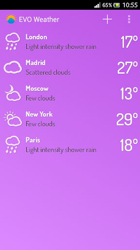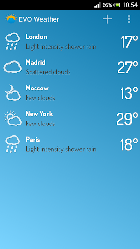 EVO Weather is a new application that allows you to check the weather forecast of more than 200.000 cities around the world. With its clear and intuitive interface you can view the current weather conditions, weather forecasts for the next 48 hours within an interval of 3 hours and for the next 7 days.