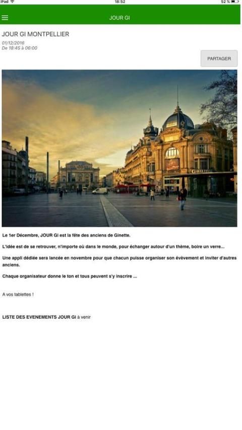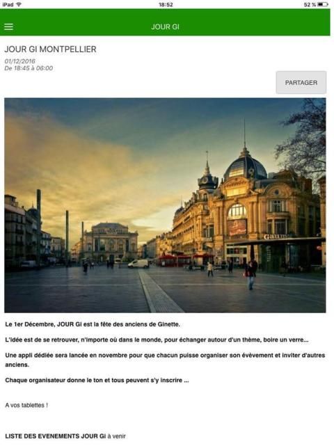 The application "Ginette Alumni Day Gi" is intended to enable each Member who wishes since its Smartphone or tablet, to invite to a meeting close Members from home, and secondly to allow all members identify meetings held close to home, and to register to attend one of them.