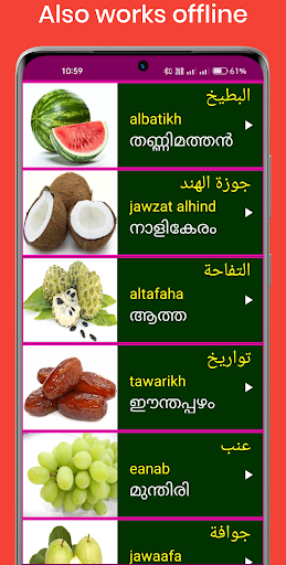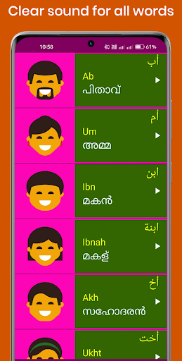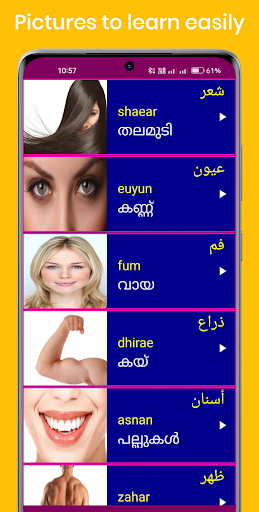 2. Each Arabic word has a clear image 📸🖼️ and audio pronunciation 🎵🔊 to make Learning Arabic via Malayalam Easy.