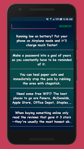 1000 Life hacks, tips and tricks to optimize your life are available in this small app. It contains Life Tips & Tricks that are easy to share and save to favorites.