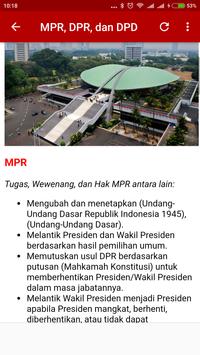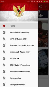 Dalam aplikasi ini terdapat beberapa materi dasar yang dijelaskan seperti: MPR (Majelis Permusyawaratan Rakyat), DPR (Dewan Permusyawaratan Rakyat), DPD (Dewan perwakilan Rakyat), Presiden dan Wakil President, Mahkamah Agung, Mahkamah Konstitusi, Komisi Yudisial, BPK (Badan Pengawas Keuangan), Kementerian Kordinator, Kementerian, Lembaga pemeritnah nonkementerian (LPNK), BUMN, Keduataan/Konsulat, dan lain-lain.