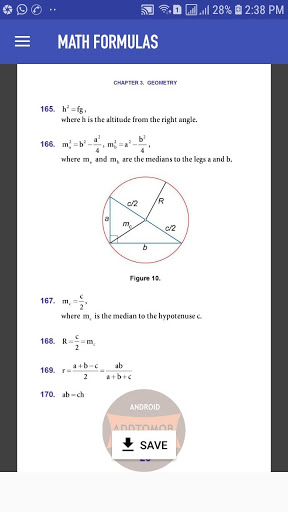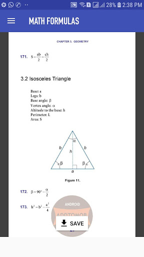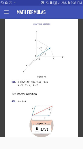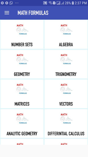 The application covers most of the Math formulas like Number sets, Algebra, Geometry, Trigonometry, Matrices and Determinants, Vertices, Analytical Geometry, Differential Calculus, Integral Calculus, Equations, Series and Probability.
