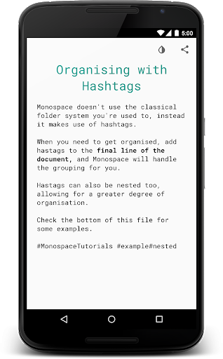 Monospace Writer's hashtags feature replace the classic folder system. Simply add hashtags (which can be nested) to the last line of a file and Monospace will take care of the file/folder organisation for you.