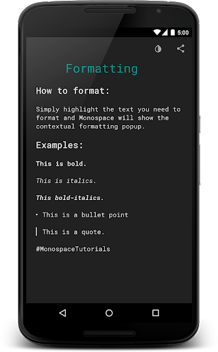 Monospace Writer supports Bold, Italics, Strikethrough, Bullet, Quote and a bunch of size related formatting styles.