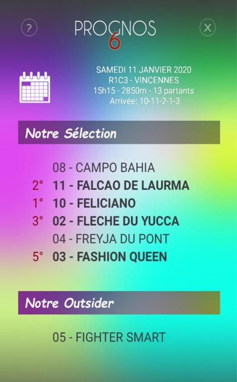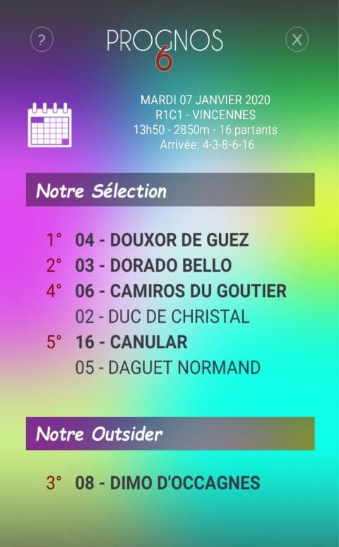 This is why Prognos6 concentrates its prognosis every day on only 6 horses, a formula very suitable for playing all reduced games, or even elsewhere in Tiercé, Quarté, Multi and Quinté. A very serious outsider completes the combination.