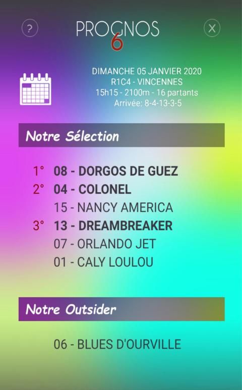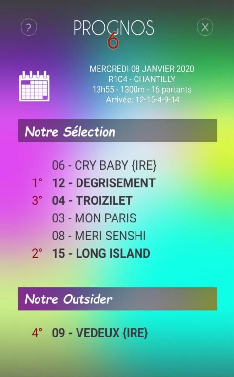 C'est pourquoi Prognos6 concentre chaque jour son pronostic sur 6 chevaux seulement, formule très adaptée pour jouer à tous les jeux réduits, voire même d'ailleurs au Tiercé, Quarté, Multi et Quinté. Un outsider très sérieux vient compléter la combinaison.