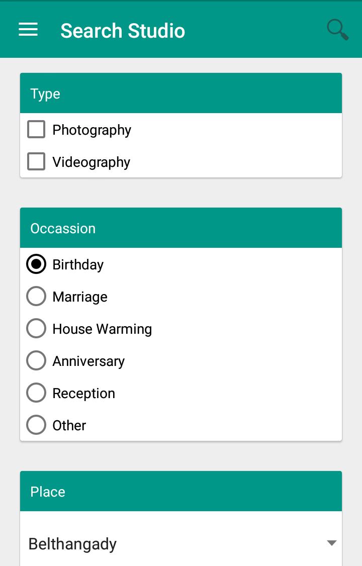 An ideal where a person can find photography studio just by a click. In this app one can sort the studio and track the nearest studio to his location and along with which he can also check whether the photographers are free or busy just by a click without the need of visiting the studio manually. In this application the studio can be tracked with respective to the events such as birthday, Marriage, House Warming, Receptions etc.