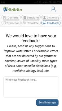 WriteBetter is a writing assistant that leverages the Data-Driven Learning (DDL) approach. DDL refers to an approach to learning foreign languages in which students discover language patterns or rules autonomously by exploring a large number of sentences written by qualified speakers of English. To do so, WriteBetter offers a function through which students can search for words to discover how to use them by exploring real sentences that contain those words. WriteBetter also has a function with which students can explore the most frequent language structures related to the words searched. Students can also enrich their texts by looking up words in an integrated dictionary, which provides definitions, synonyms, antonyms, and examples. This dictionary is WordNet, a large lexical database of English published by Princeton University. Another function of WriteBetter is an English-Spanish translator, with which students can understand the words they are searching for through contextualised human-made translations. Finally, WriteBetter also has a grammar checker, with which students can correct their language mistakes.The corpora that WriteBetter uses are Wikipedia articles, and around 3,000 public domain English books.