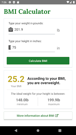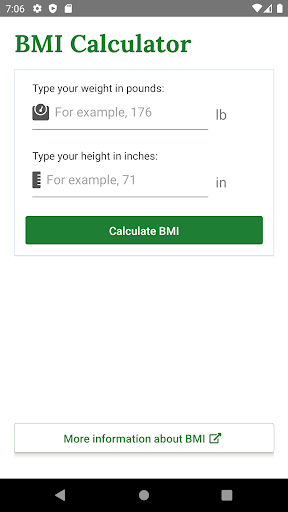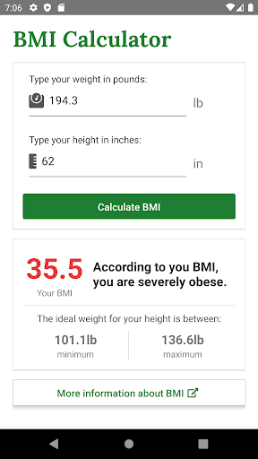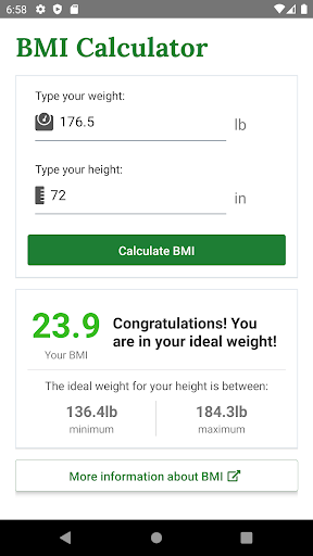 This application calculates a person's body mass index (BMI), according to their weight and height. You can calculate your BMI, clear your doubts, and know if you are above your ideal weight.