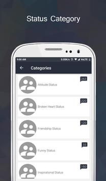 with category including Attitude status, broken heart status, friendship status, funny status, inspirational status, life status, motivational status. sad status and many more.
