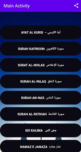 In this application contain 4 qul , 6 kalima , nemaze janaza , ayatul kursi, and surah fatiha .