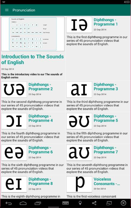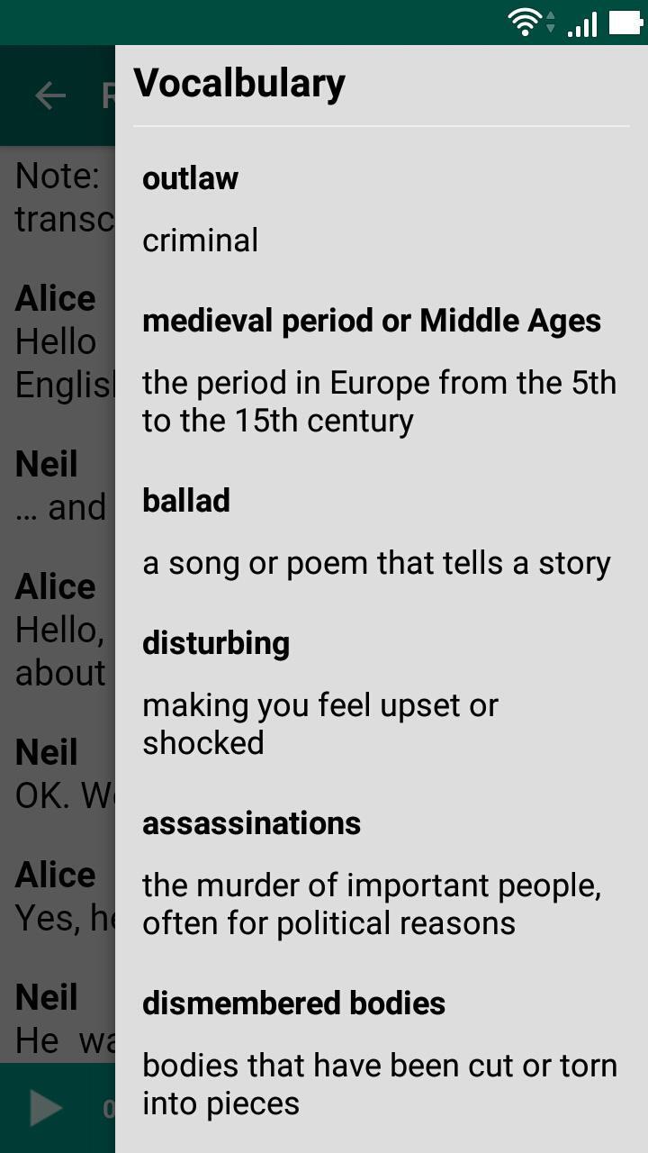 - 5 categories : 6 Minute English, English At Work, Express English, Words in the news and The English we speak.