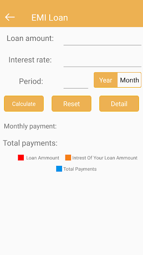 Calculate EMI: Enter Loan Amount, Interest rates (%), and Period (Years / Months). You can view statistics in terms of year or month.
