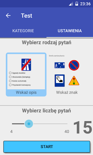 Oprócz tego użytkownik może przeprowadzić testy ze znajomości znaków, które może sobie sam zaprojektować wybierając kategorie znaków, które chciałby powtórzyć, liczbę pytań oraz rodzaj testu: dopasowanie znaku do opisu lub dopasowanie opisu do znaku.