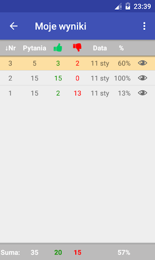 Wyniki testu są zapisywane do tabeli, do której użytkownik ma zawsze dostęp i może sprawdzić swoje osiągnięcia, a nawet przejrzeć cały swój test.