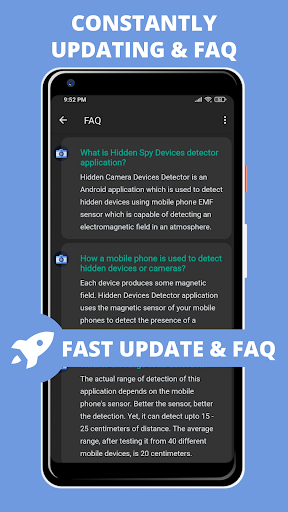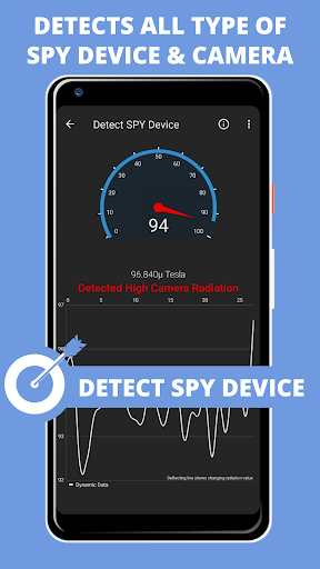 Spy device - It works on the principle of an electromagnetic scanner. In most phones, there is an electromagnetic sensor that can catch electromagnetic signals. Many electric devices emit signals. If there is a camera hidden behind the mirror in the changing room or in the shower which is not visible by the naked eye then with the help of our application you have to scan the area. Keep in mind that the distance between the object and the device i.e. the phone should be in the range of 5cm-10cm. The sensor in your phone will detect if any magnetic signal is caught or not. If the signal is more than the usual then it would alert you with a beep sound that there is a possibility of a hidden camera present nearby.