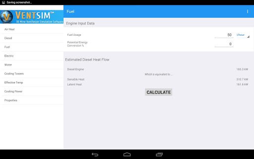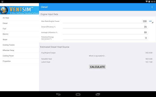 The diesel fuel calculator provides an alternative way to calculate engine power within a ventilation model, overcoming the need to estimate engine utilization. It calculates diesel engine power by using the calorific heat value of fuel, and back calculating engine power using the diesel efficiency setting (by default 35%)