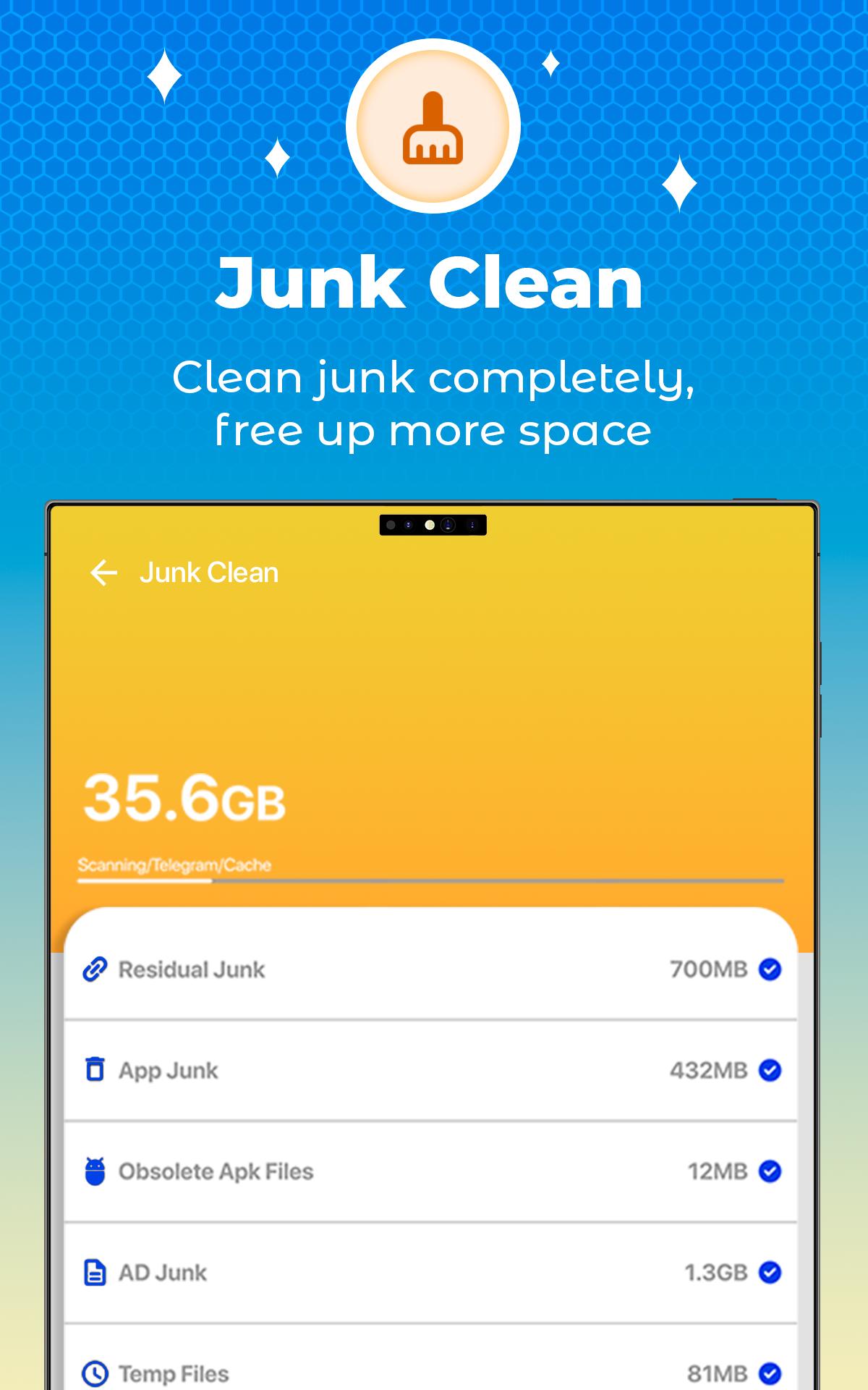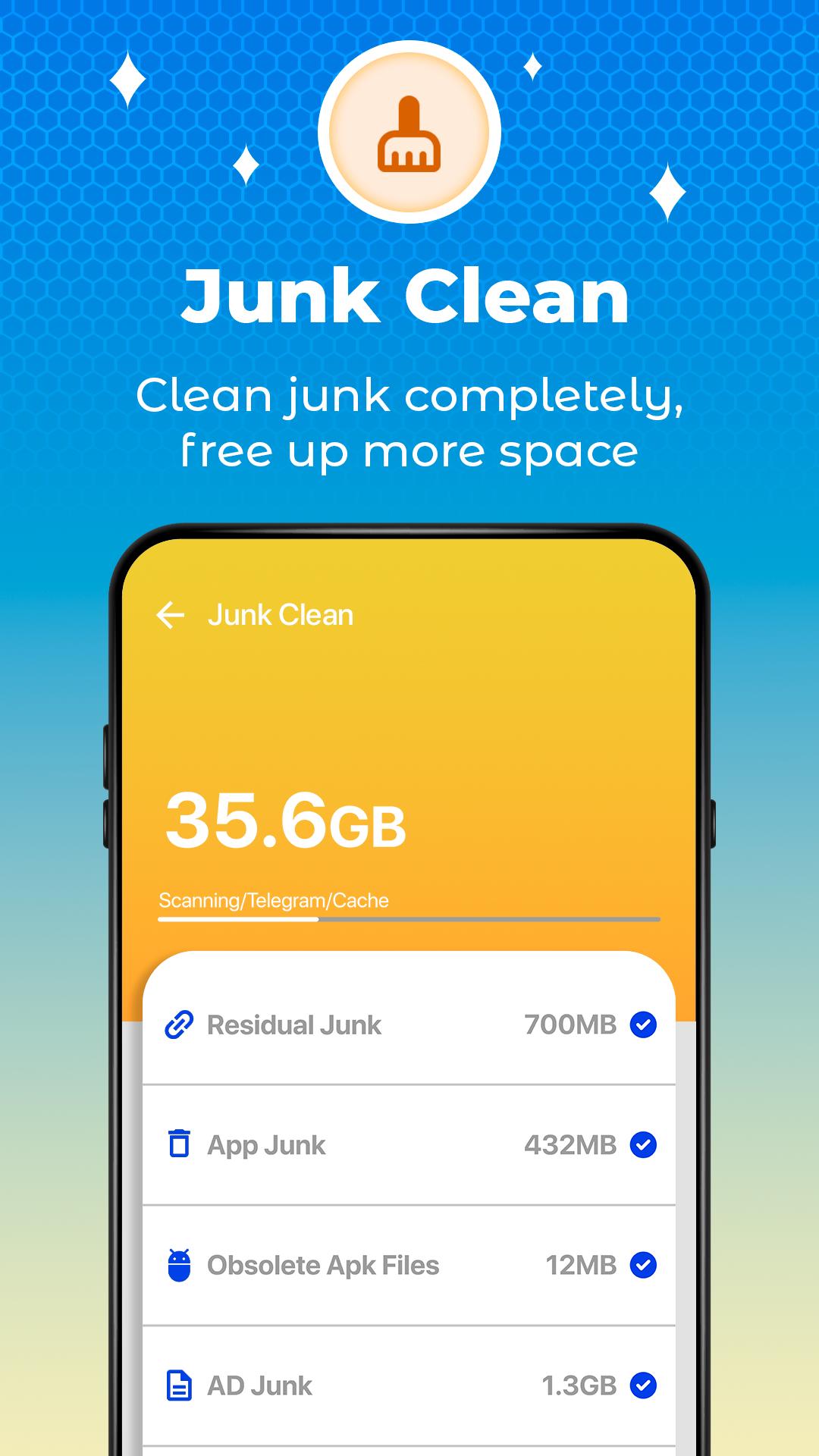 Effective junk cleaner that frees up storage space by removing junk files like temp files, app cache, temp files, Apk files from the phone.