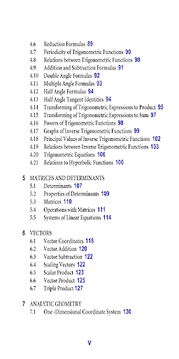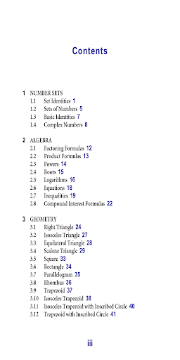This App Contains 1300 Math Formulas Index 1. Number Sets 2. Algebra 3. Geometry 4. Trigonometry 5. Matrices & Determinants 6. Vectors 7. Analytic Geometry 8. Differential Calculus 9. Integral Calculus 10. Differential Equations 11. Series 12. Probability