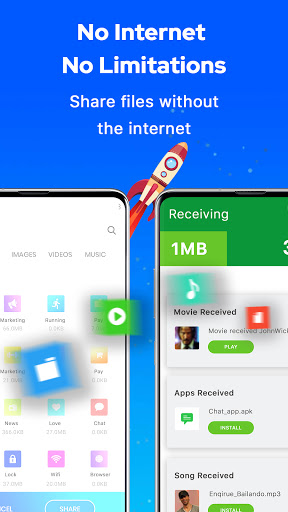 Share files, Movies, Video, Apps, Pictures with other Android phones while being offline directly without the internet, cables, or Bluetooth. Send & transfer files without any limitations. Share files in seconds with our easy-to-use file sharing & transfer app.