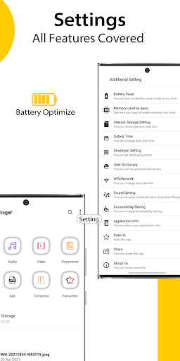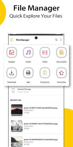 The optimized search engine of file explorer will find file in internal storage and SD card in 1 second. And users can browse files by category, e.g. image, music, video, apps, etc.