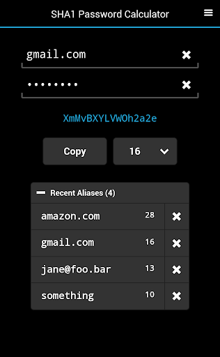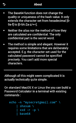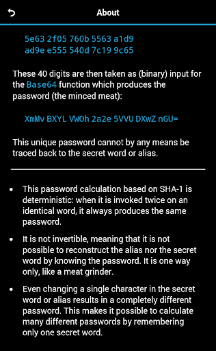 In contrast to other apps strong passwords are calculated and not just generated. No confidential data is stored or does leave the device. No special app permissions are required. The network is not used. Source code is available on GitHub: