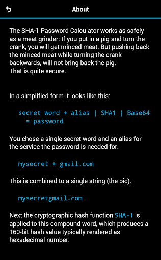 You chose a single secret word (your secret master password) and an alias for the service the password is needed for (the pig), e.g. mysecret gmail.com. Next the cryptographic hash function SHA-1 is applied to this combined word which at the end produces a strong unique password (the minced meat). This calculated password is then copied to the clipboard to be used wherever it is needed. In addition a QR code is created.