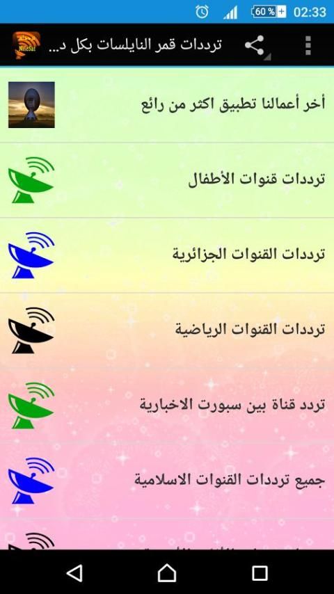 Discover apps for Android here, 30,000+ users downloaded ترددات قمر النايلسات بكل دقة latest version on 9Apps for free every week! You can enjoy it by use in your own phone. This hot app was released on 2017-06-19. Just download it and use on your android phone!