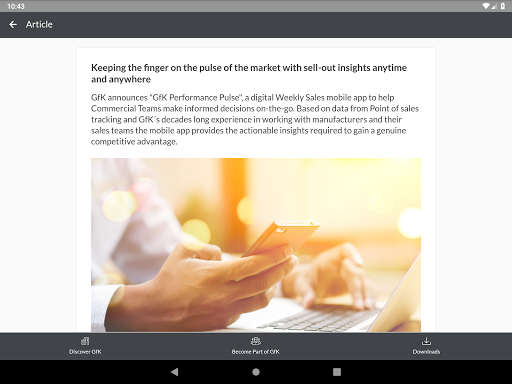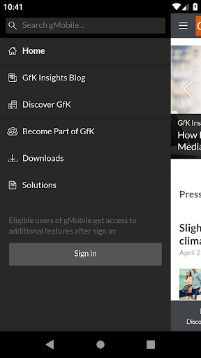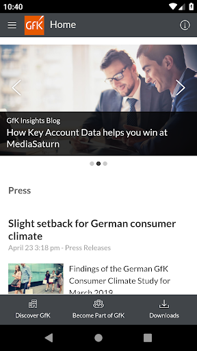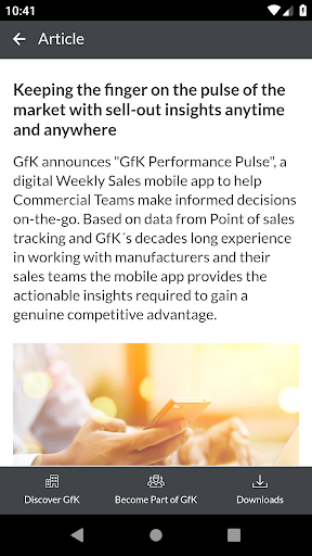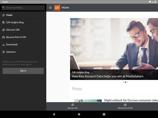 The GfK gMobile App provides customers, business partners and employees with information and news about GfK on a daily basis. Users receive the latest news, press releases and insights via push notification and get direct download access to White Papers. Information regarding career opportunities and the opportunity to directly apply for open positions are also available.