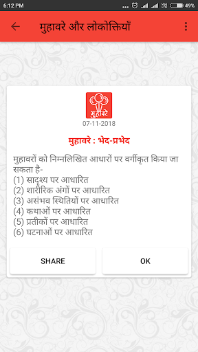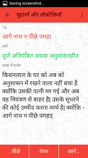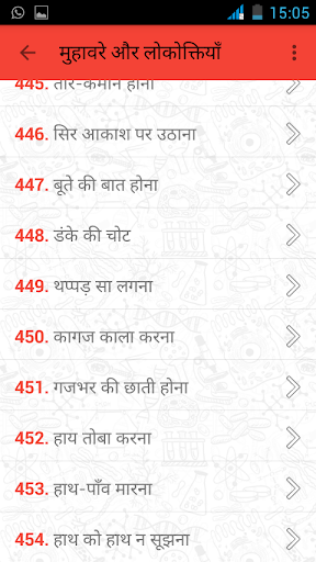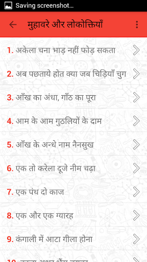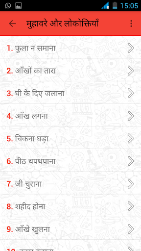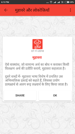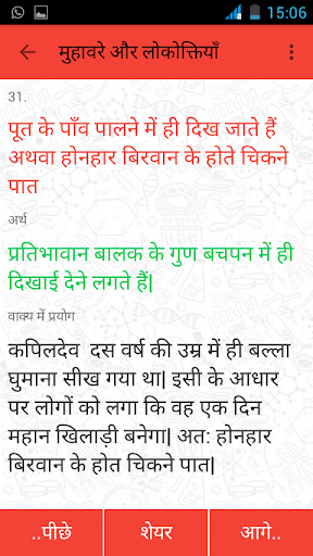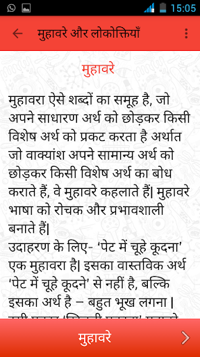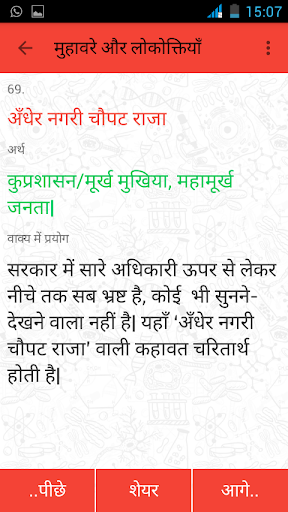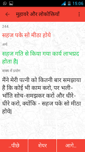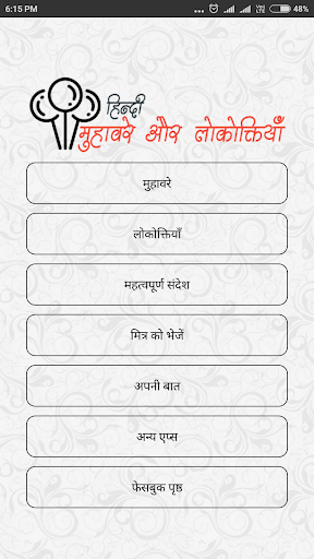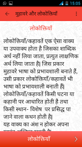 हिन्दी के प्रति रुचि जागृत करने के लिए बनाये गए इस एप में मुहावरे और लोकोक्तियाँ उनके अर्थ और वाक्यों में प्रयोग संकलित किए गए हैं|