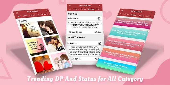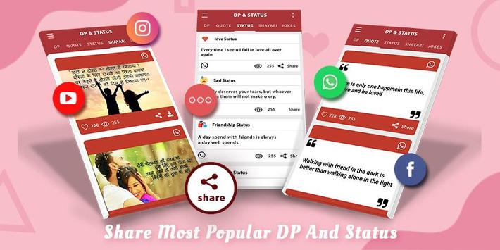 DP and status app is one of the best creative and latest app specially for who having habit to change their social profile with some inspiring pictures or some love images or else.in dp and status app you can fine so awesome and all categories related whatsapp dp or profile.