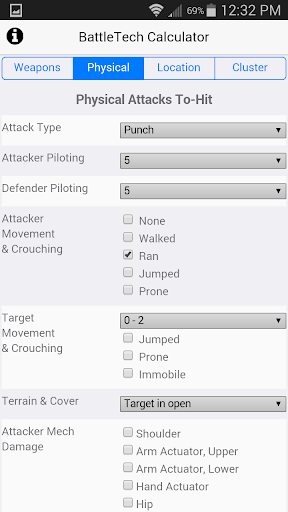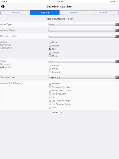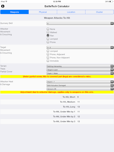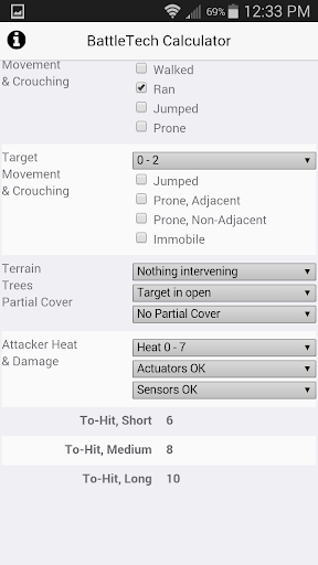 Keep your BattleTech game on the move with this handy calculator. Quit counting on your fingers, and forgetting which rules have what adjustment numbers -- just check-off the list, and your to-hit numbers are at the bottom.