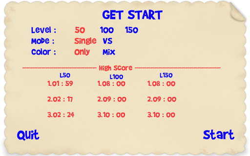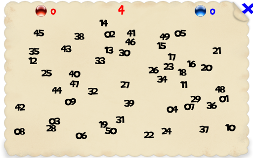 In game you must use your eyes and hand as quick as you can to find all numbers from 1 to 50 or 100 or 150. Have 2 mode for your choice : single or VS (play with your friend):