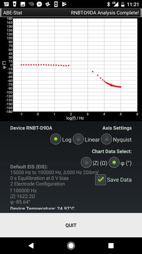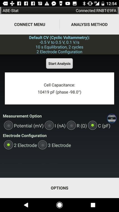First version of wireless interface to open-source "ABE-Stat" instrument. Interface includes basic multimeter functions (open circuit voltage, resistance, capacitance, and current measurements at applied DC bias for two and three electrode configuration networks), as well as basic electrochemical analyses including Cyclic Voltammetry, Electrochemical Impedance Spectroscopy, and Differential Pulse Voltammetry.