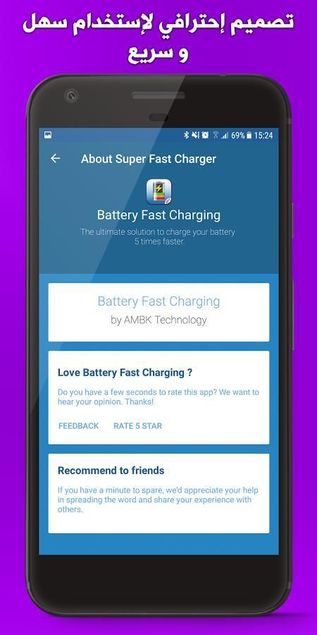 يساعدك هذا البرنامج على شحن هاتفك بسرعة أكبر ب 5 مرات من السرعة العادية حيث يتم تفعيل البرنامج تلقائيا في الخلفية عند توصيل شاحن الهاتف بالتيار الكهربائي.