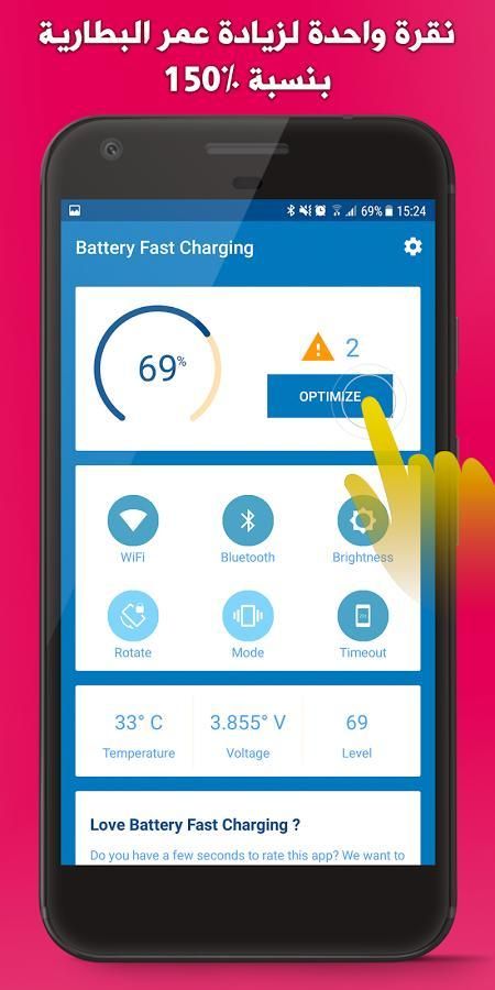 بعد عملية تثبيت التطبيق، كل ما تحتاجه هو مجرد نقرة واحدة على زر "OPTIMIZE" لتعطيل كافة الخدمات التي تستنزف البطارية ك WI-FI، وتقنية " Bluetooth"، والسطوع التلقائي، دوران الشاشة، مهلة الشاشة، بالإضافة إلى وظائف أخرى تعمل في خلفية الهاتف والتي تعيق عملية شحن البطارية بشكل سريع.