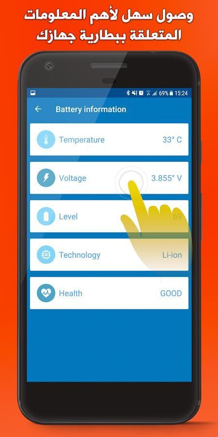 كما ستجدون على الصفحة الرئيسية لتطبيق "شحن البطارية السريع" لمحة عامة عن صحة البطارية مثل درجة حرارة البطارية الحرارة بC°، والجهد البطارية، والنسبة المئوية للطاقة البطارية. كما يمكنك الاطلاع على معلومات أخرى مفيدة عند الدخول إلى قسم التفاصيل.