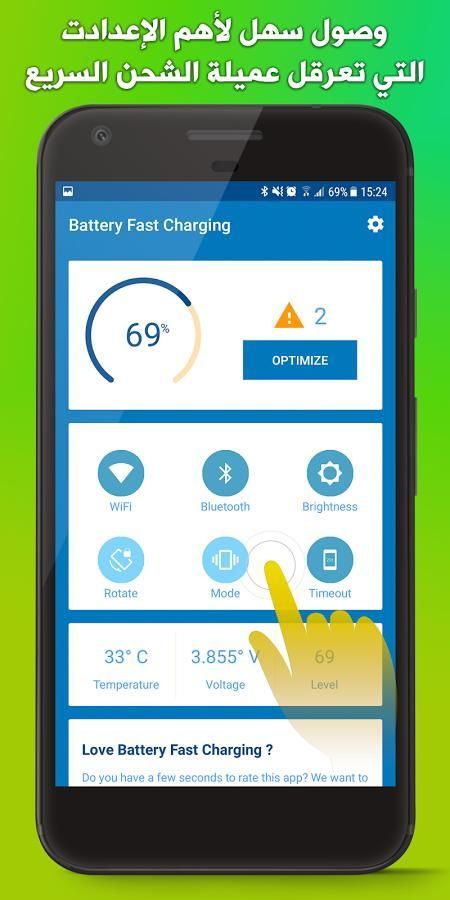 تطبيق "تسريع شحن البطارية - Battery Fast Charging" هو تطبيق مجاني يساعدك على إعادة شحن البطارية بشكل أسرع من المعتاد وزيادة عمر البطارية عن طريق تعطيل أهم البرامج والخدمات التي تعيق عملية تسريع شحن بطارية.