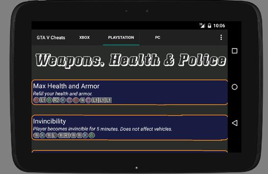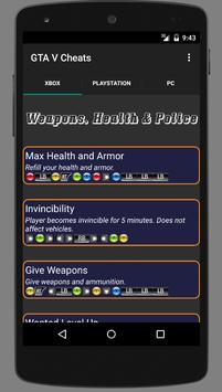 This application provides quick and easy access to every cheat code for GTA V game that has been released, on all consoles and platforms.