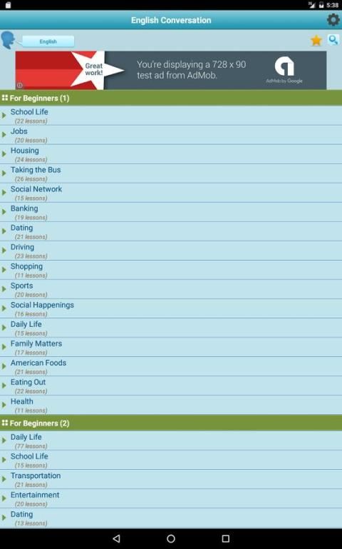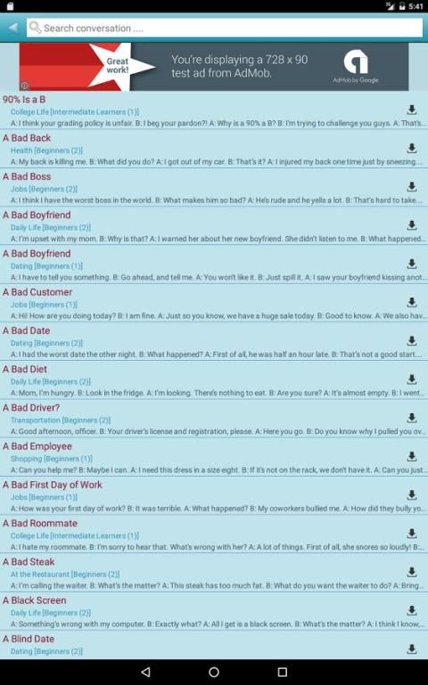 التطبيق يتيح لك الوصول إلى أكثر من 2500 محادثة في اللغة الإنجليزية، موزعة على 85 فئات مختلفة. من يرجع تاريخها، والقيادة، والشبكات الاجتماعية إلى وسائل النقل، والخدمات المصرفية، أو السكن - التطبيق يوفر لك عددا من الأحاديث اليومية باللغة الإنجليزية أن تتمكن من دراستها في أي وقت.