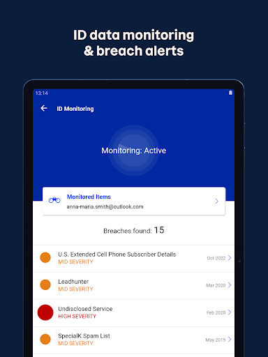 منع سرقة الهوية مع مراقبة الويب المظلمة على مدار الساعة طوال أيام الأسبوع وتنبيهات خرق البيانات.إذا كان خرق البيانات يهدد التفاصيل الشخصية ضمن حساباتك عبر الإنترنت ، فكيف ستعرف؟لأن حماية هوية F-Secure تنبهك إذا حدث ذلك.تمنحك تنبيهات الوقت الفعلي وقتًا لتأمين التفاصيل الخاصة بك وتجنب سرقة الهوية