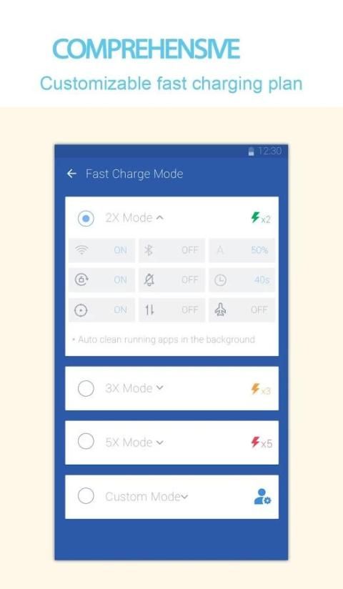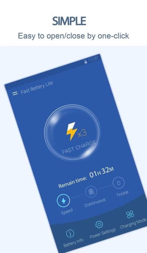 قاعدة وساهم شاحن سريع لايت على أحدث والحداثية خوارزميات الرياضيات، ومساعدة سرعة شحن تصل إلى 160٪. وبالإضافة إلى ذلك، التطبيق يعطي العديد من الخيارات لتشغيل / إيقاف واي فاي، والصوت، مصباح يدوي، وتقنية بلوتوث، السطوع، GPS، اتصال البيانات المتنقلة، وضع الطائرة من أجل إنقاذ البطارية.