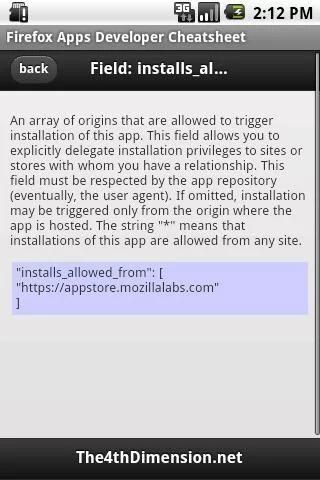 كما الكثير منكم قد لا تكون على علم بأن موزيلا سوف يتوجه قريبا إلى إطلاق تطبيقات ويب مخزن قريبا في عام 2012، وهذا التطبيق هو مساهمة والتشجيع في الحصول على الناس للبدء في تطوير التطبيقات للويب المفتوحة. يسرد هذا التطبيق القيم المستخدمة في ملف AppManifest.json للتطبيقات ليتم تطويرها لموزيلا المتجر.