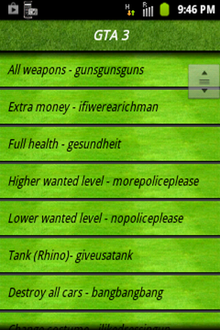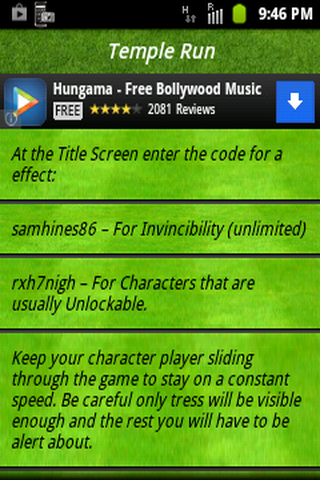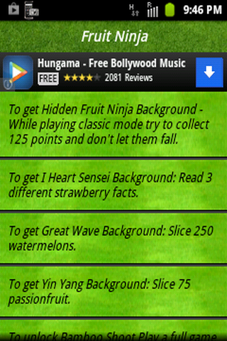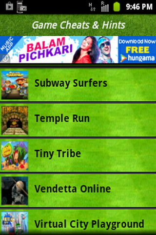 Getting stuck with your android games? Not able to progress higher levels or complete the game ?Our Free-Online/Offline App contains huge collection of tips, hints,unlock tasks and cheat codes for various popular android games.Never ever get stuck again on difficult level,play every game and various game hints and cheats in your pocket.FEATURES :App includes a number of popular games like** Grand Theft Auto III** Temple Run** Plants vs. Zombies** Grand Theft Auto IV** fruit Ninja** Angry birds ** Subway Surfers** Bike Race** Doodle Jump** Bad Piggies** Virtual city playground** And lots more !...Easy to use and search Every phone and tablet screen size is supported.The App is free and you can use in offline also.NOTE:*** More game hints and cheats will be added frequently.Checkout for updates.*** Your suggestions are most welcome.Please mail your suggestions for further improvement of the App.