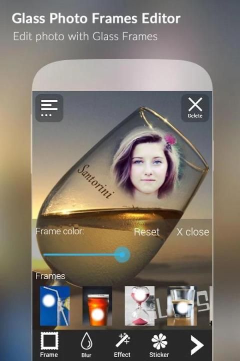 Bring glass material into your photo frames with many glass frames and blurred border of background. App let you easy create photo frames with glass material styles like : cup of coffee, cocktail glass, building, heart v.v... And share via Facebook for your friends.