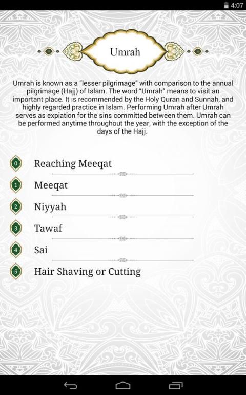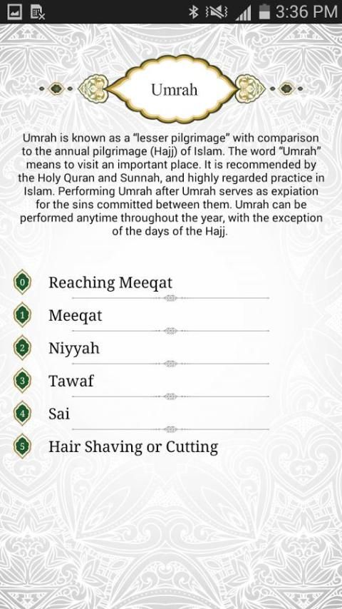 الحج والعمرة دليل يوفر شاملة وسهلة لفهم دليل حول الحج إلى مكة المقدسة (مكة المكرمة). آسر واجهة، وضرب الرسومات، دعم الصوت، والخرائط البصرية، وجعلها دليلا سهل الاستعمال الأمثل. يمكن أن يتعلم الحجاج الطقوس إلى جانب الأماكن الخاصة؛ مثل، ما لأداء / يقرأ في الكعبة، مسجد الحرم ومنى والصفا و آل المروة، مزدلفة، وجبل عرفات.
